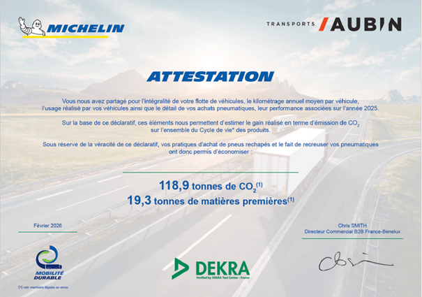 Une nouvelle attestation d'économie de CO2 pour les Transports AUBIN